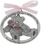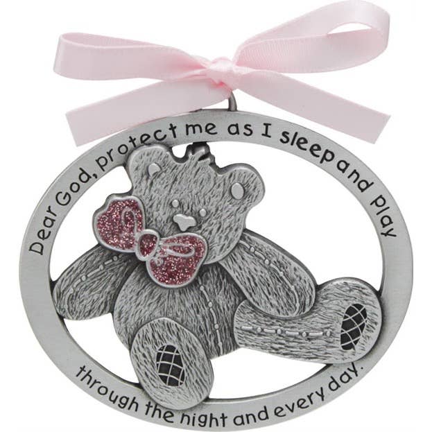 Teddy bear in silver enamel finish w/sparkling pink epoxy & soft pink ribbon, etched prayer for protection, carded.