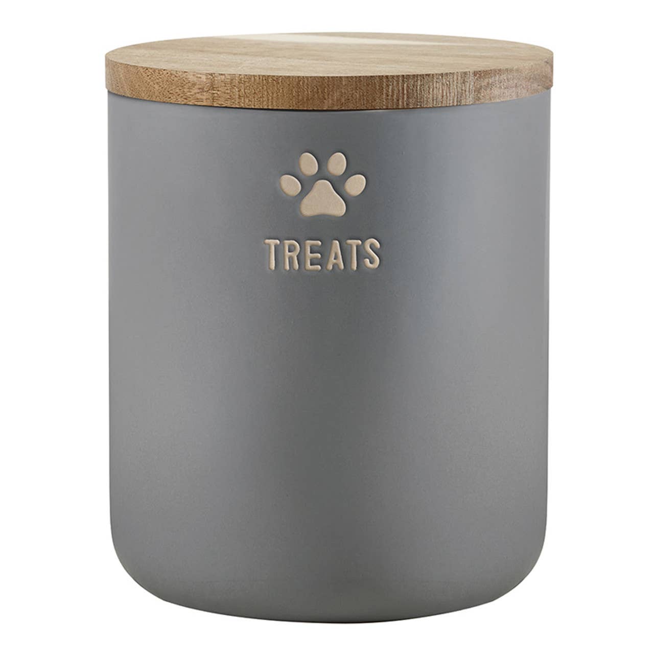Add a modern, sophisticated touch to your kitchen countertops with this high-quality ceramic canister set. Keep your pets treats fresh in this air tight canister. •Crafted from high-quality ceramic with debossed phrasing and matte glaze finish •Acacia wood lids with tight fitting rubber gaskets to keep food fresh •Essential addition for all your pets dry food storage needs •Minimal, modern design. 7.75" x 6.25"