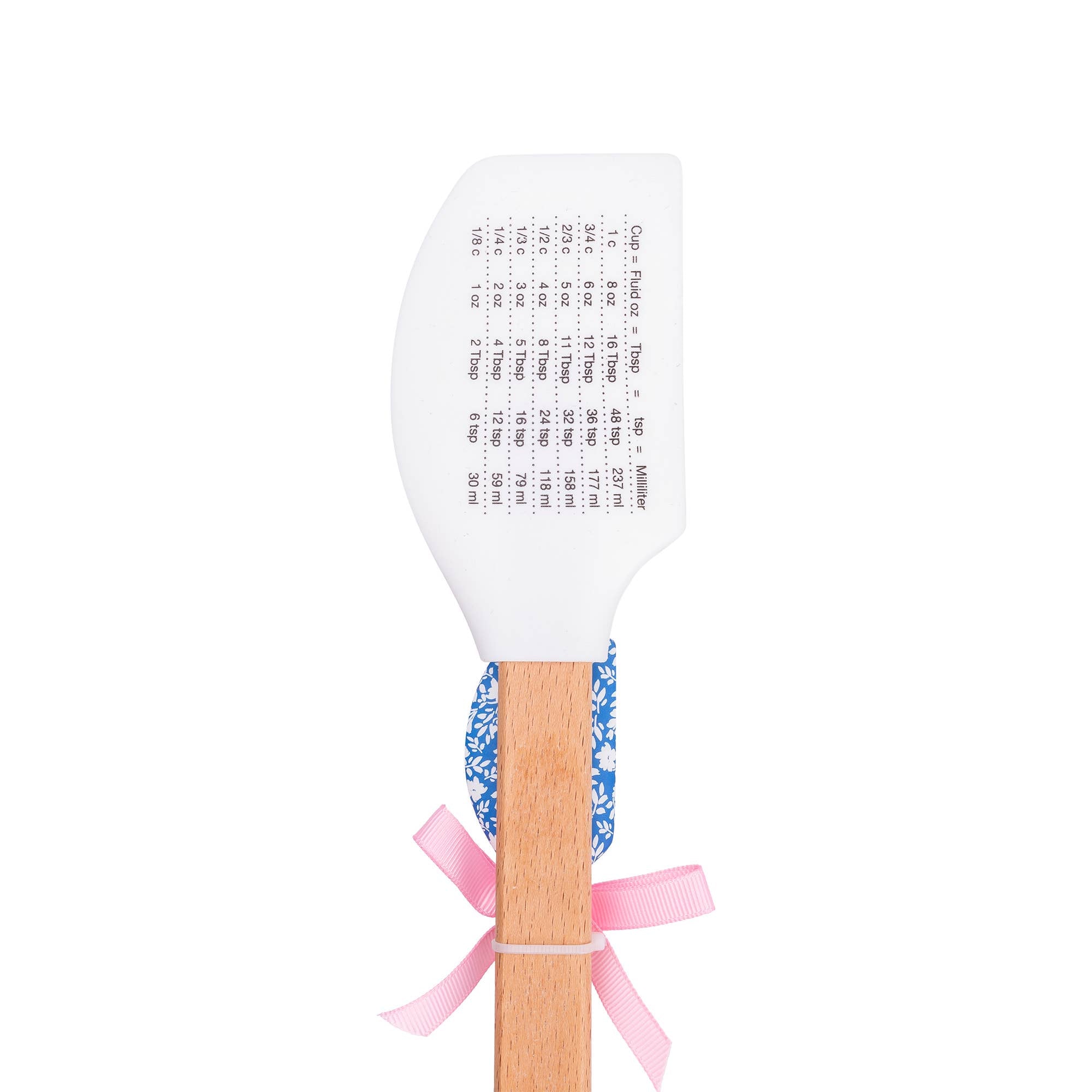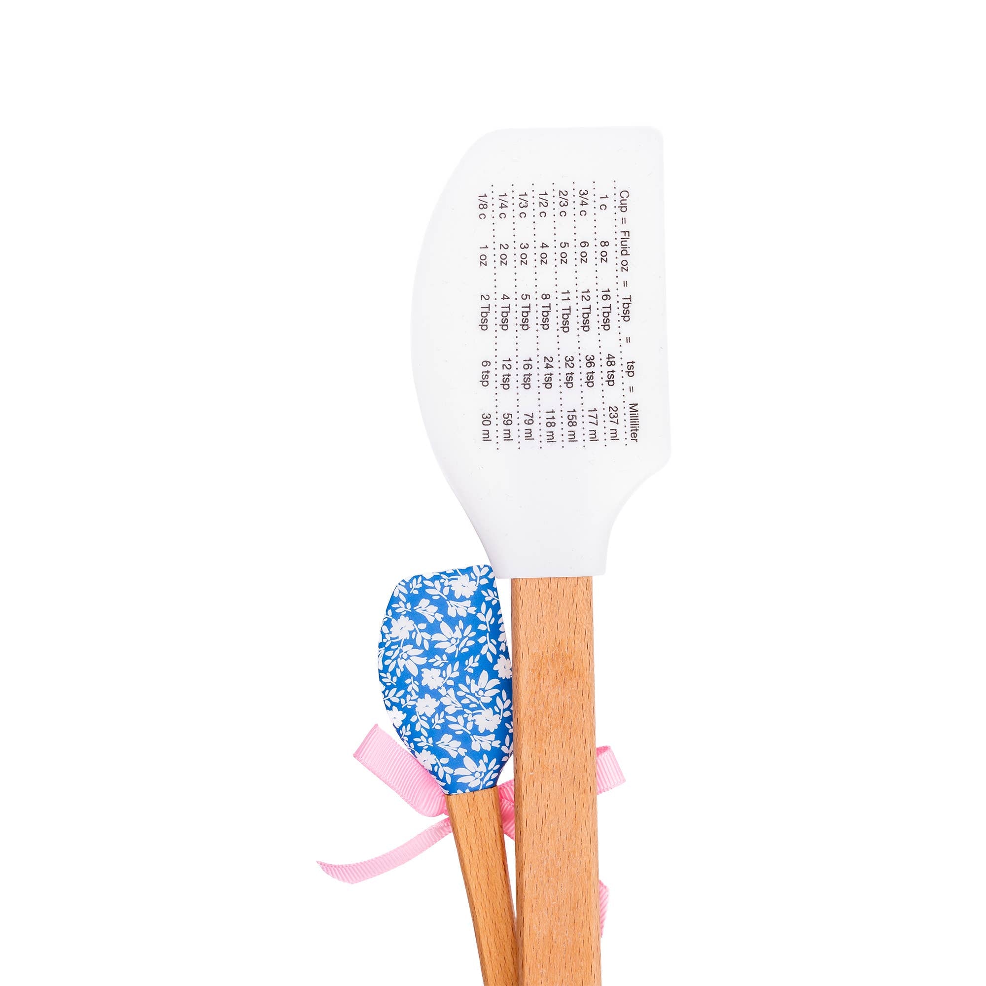This spatula set features BPA-free silicone tops and beechwood handles for safety and comfort. The large spatula includes a measuring conversion table on the back. Heat resistant up to 500 degrees, stain-proof, and dishwasher-safe silicone tops make cooking hassle-free. Includes a large spatula (2.5" x 12.75") and a small spatula (1.25" x 8.25").
